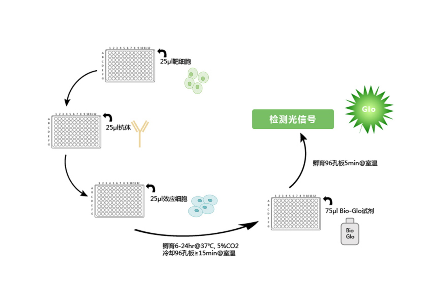 本系統(tǒng)采用基因工程改造的Jurkat細(xì)胞作為效應(yīng)細(xì)胞,該細(xì)胞穩(wěn)定表達(dá)FcγRIIIa受體(V158高親和力突變體)和由NFAT應(yīng)答元件驅(qū)動表達(dá)的螢火蟲螢光素酶。抗體通過與效應(yīng)細(xì)胞表面FcγRIIIa的結(jié)合,激發(fā)細(xì)胞內(nèi)NFAT反應(yīng)元件,NFAT反應(yīng)元件則驅(qū)動螢火蟲熒光素酶的表達(dá)。熒光素酶活性通過生物發(fā)光進(jìn)行定量。