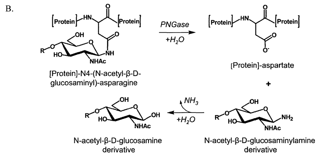 圖1A. PNGase F特異性切割位點(diǎn);圖1B. PNGase F釋放糖鏈的反應(yīng)機(jī)制