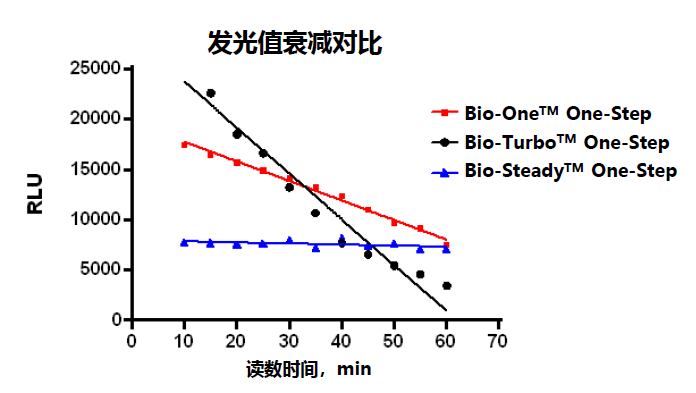 本試劑盒在常用的細胞培養(yǎng)基中可提供超過5小時的信號半衰期,并且不需要樣品預(yù)處理。在標準實驗室條件下,每小時可實現(xiàn)數(shù)千個樣品的吞吐率,并且具有很高的重現(xiàn)性,非常適合高通量和超高通量(96/384/1536孔)的檢測哺乳動物細胞中螢火蟲熒光素酶報道基因的表達。可以檢測最低10-20mol的熒光素酶,在10-20至10-14mol的酶濃度范圍內(nèi)呈很好的線性關(guān)系。不同熒光素酶檢測試劑盒的發(fā)光值衰減對比如圖2所示。